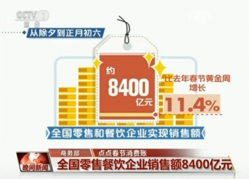 原标题:[点点春节消费账]全国零售餐饮企业销售额8400亿元