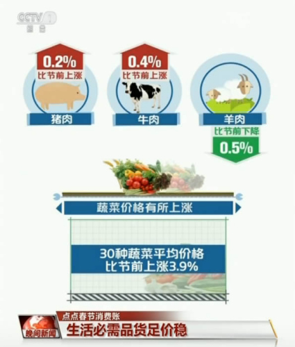 春节期间,各地的生活必需品市场供应充足、品种丰富、价格总体平稳。粮食价格略有上涨,肉类价格小幅波动,蔬菜价格有所上涨,30种蔬菜平均价格比节前上涨3.9%。