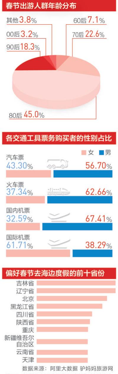 通过大数据观察,春节游客的组成和出行人数正发生变化。在携程上,80%以上预订游客以家庭为单位。旅游专家分析,这说明家庭旅游的趋势越来越明显。在中国社会老龄化趋势、二孩放开的背景下,家庭旅游市场会不断扩大。
