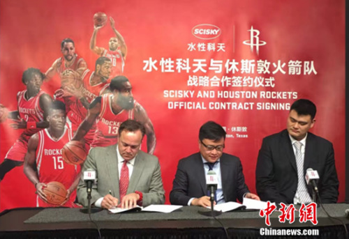 中新网2月4日电 美国中部时间2月3日(北京时间2月4日),水性科天与休斯敦火箭队战略合作签约仪式在火箭队主场丰田中心球馆举行,水性科天正式宣布成为休斯敦火箭队官方合作伙伴,未来双方将全方位展开战略合作。休斯敦火箭队俱乐部首席执行官泰德•布朗、科天集团董事长戴家兵博士、科天环保大使姚明等嘉宾出席签约仪式。