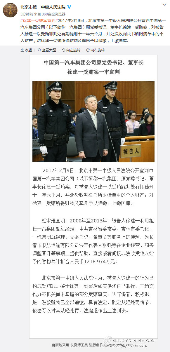 中新网2月9日电 据北京市第一中级人民法院官方微博消息,2月9日,北京市第一中级人民法院公开宣判中国第一汽车集团公司原党委书记、董事长徐建一受贿案,对被告人徐建一以受贿罪判处有期徒刑十一年六个月,并处没收判决书所附清单中的个人财产;对徐建一受贿所得财物及孳息予以追缴,上缴国库。