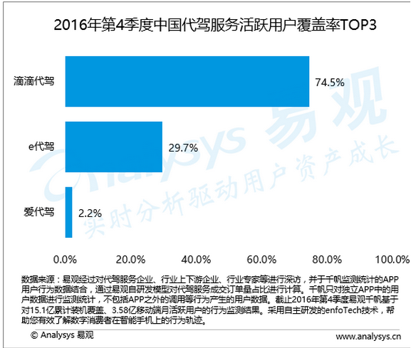 易观日前发布的《2016年第四季度代驾市场报告》显示,滴滴代驾、e 代驾和爱代驾持续占据代驾市场前三把交椅。其中,滴滴代驾以74.5%的份额独占鳌头,大幅领先于份额为29.7%的e代驾。
