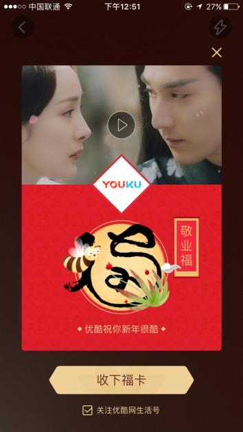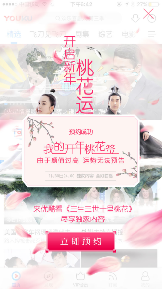 此外,优酷充分利用移动平台的互动优势,创新推出预约看剧活动,激发用户关注。优酷在APP开启了“预约开年桃花运”预约看剧活动。据悉,该活动运用了先进的Pop-layer技术,此类技术能够生成与APP相匹配的视觉效果,网友打开优酷APP,粉色桃花悬于屏幕,未见内容先见声势,能够起到引导和渲染气氛的作用。随后,视觉演绎之后,网友则可以预约看剧,并生成个人专属的2017桃花签。