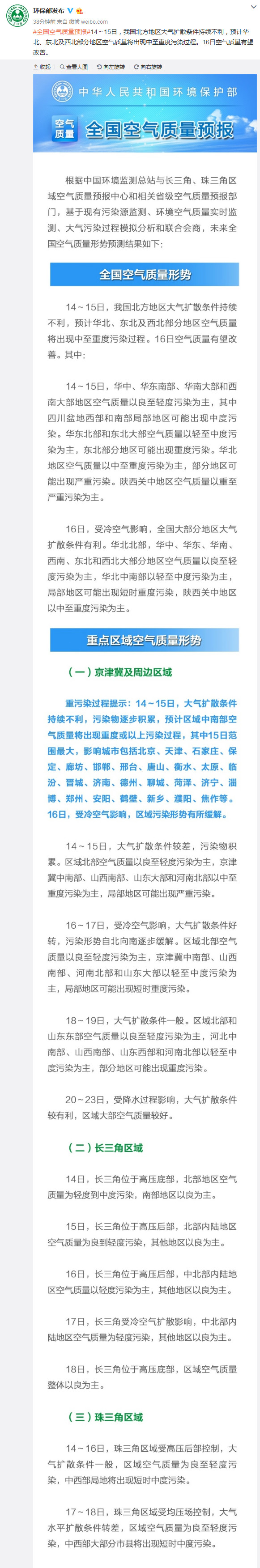 中新网2月13日电 据环境保护部宣传教育司官方微博消息,14~15日,中国北方地区大气扩散条件持续不利,预计华北、东北及西北部分地区空气质量将出现中至重度污染过程。16日空气质量有望改善。