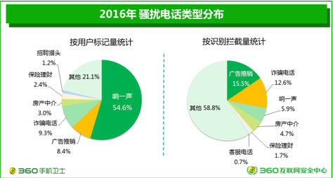 从拦截量来看,360手机卫士去年共为用户拦截骚扰电话385.1亿次,创历史新高,比2015年大幅增涨41.3%。其中12月份拦截次数达到峰值,仅一个月便达50万次。其中广告推销类骚扰电话占比15.5%位居首位,其次为诈骗电话、“响一声”、房产中介和保险理财类骚扰电话。