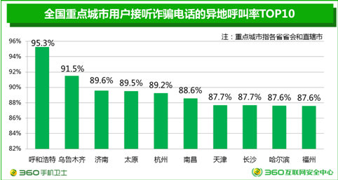 全国重点城市用户接听诈骗电话异地呼叫率TOP10