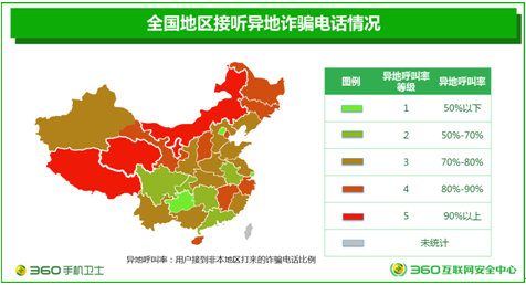 同时360手机卫士对诈骗电话进行了专项研究,数据显示,诈骗电话异地作案的情况十分显著。据悉,全国范围内,诈骗电话的异地呼叫率为68.8%。从全国各省级行政区的情况来看(港澳台地区除外),仅有上海、贵州、北京、安徽、四川、广东、重庆7个省级行政区的诈骗电话异地呼叫率低于全国均值。余下各地区的诈骗电话异地呼叫率均高于全国水平,尤其是西藏、青海、内蒙古、宁夏等地区,诈骗电话的异地呼叫率在90%以上。