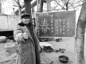 春节期间,除了春晚,最被全国观众热议的节目恐怕就是央视的“中国诗词大会(第二季)”了。参加节目归来,老王大年初三就开始像往常一样在省会街头出摊修自行车。每天早上7点多出来,一直到17时左右回家。在他摊位旁的小黑板上,用红色粉笔写着大大的“春”字,还有他创作的新诗。