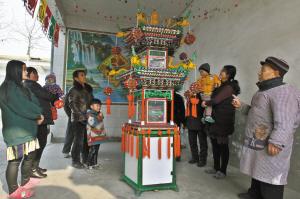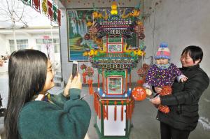 2月8日上午,无极县大中郎村一户人家的院子里,一位年轻妈妈正抱着孩子看花灯,孩子的目光紧紧追随着花灯内正在转动的“凤凰”。听到说话声,花灯的制作者高吃从屋里走了出来,笑着给孩子塞了小吃,又给前来看花灯的村民们讲解花灯的构造。