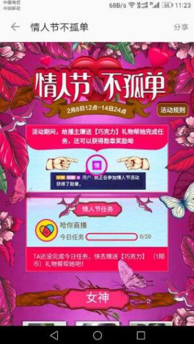 完成任务的播主不仅会实时收到哈你直播10013官方账号发来红包,而且在开播时选择情人节话题分类还能享受到推荐位的奖励,可以让更多的人看到,一不小心有可能成为网红哟,任务值越大,完成后的推荐位越好。