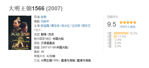 《大明王朝1566》是由张黎执导,陈宝国、黄志忠、王庆祥、倪大红等主演的历史题材电视剧。该剧讲的是明朝嘉靖年间,皇帝朱厚熜(陈宝国饰)刚愎自用,奸臣严嵩(倪大宏饰)权倾朝野,忠臣海瑞(黄志忠饰)直面皇权发起挑战的故事。重量级导演和老戏骨们的强强联手,一展国剧实力,豆瓣评分高达9.5。