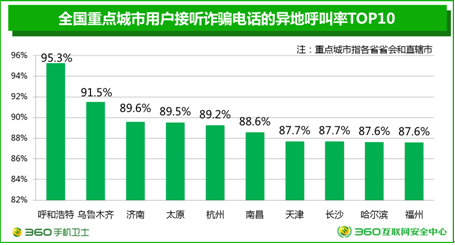 具体到各个重点城市的情况,呼和浩特(95.3%)、乌鲁木齐(91.5%)两地排名居前,异地呼叫率均高达90%以上。此外,济南、太原、杭州、南昌、天津、长沙、哈尔滨、福州等地也是用户接听异地诈骗电话的高发城市。