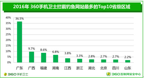 360大数据对钓鱼网站地域分布也进行了精准分析,整体来看,手机端钓鱼网站拦截量占比最高的地区为广东省,以压倒性的36.5%位居榜首;其次为广西(9.7%)、福建(8.6%)、湖南(6.8%)和江西(3.8%)。