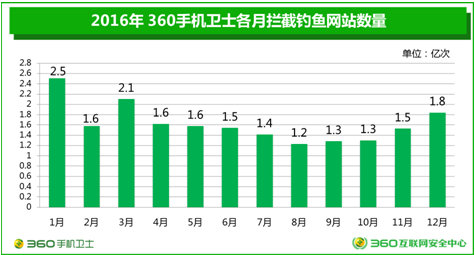 钓鱼网站的活跃期也存在差异。360专家表示,综合2016年各月的钓鱼网站拦截量情况,可以看出全年的钓鱼网站活跃程度呈现中间低、两头高的特点。1月份钓鱼网站拦截量最高,达到2.5亿,8月最低(1.2亿次)。