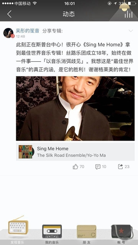 网易云音乐的用户在吴彤动态和专辑《Sing Me Home》下纷纷点赞,评论。用户FreezZZZ评论称,很难想象吹着笙箫唱摇滚的吴彤,几经轮回,成就格莱美!更有细心的用户发现,早在去年4月份,网易CEO丁磊即在专辑《Sing Me Home》里发表评论,称“马友友与丝绸之路合奏团,期待看到纪录片”。