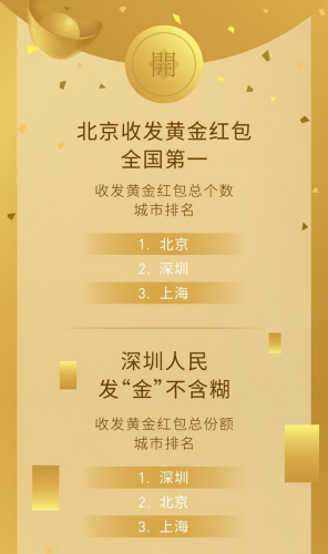 不过,你以为北京“老炮儿”都是土豪吗?在收发黄金红包“总份额”的排名中,深圳却拔得头筹,超越京沪两地。深圳的闫先生和马先生分别位列收、发黄金份额的首位,成为鸡年春节当之无愧的“多金男”。