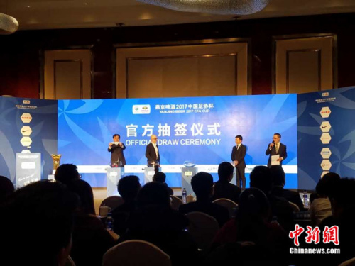 中新网2月9日电 新春伊始,燕京啤酒2017足协杯抽签仪式于2月9日下午在北京昆仑饭店正式举行, 64支球队抽签纷纷落位。中国足协职业联赛理事会执行局局长马成全、中国足协执委、新闻委员会主任汪大昭,中央电视台主持人张斌、足球名将孙继海,以及北京燕京啤酒集团公司副总经理谢广军等出席此次抽签仪式。今年也是燕京啤酒连续第4年赞助足协杯赛事,旨在支持和推动中国足球以及中国体育事业的发展,在提高“运动全民化、足球水平专业化”的同时,助推中国足球的早日腾飞。