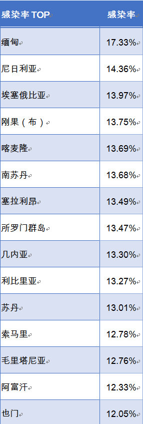 如果按病毒感染率统计,国家排名和感染量统计有显著不同,手机病毒感染率最高的是位于亚洲、非洲的第三世界国家,他们的手机病毒感染率远超世界平均水平。