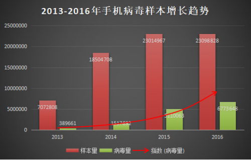 中新网2月13日电 2月8日,猎豹移动安全实验室发布《2016年网络安全研究报告》。报告显示,2016年全年捕获病毒样本总量为39528276个,比2015的104674316个减少62.2%,电脑病毒新增样本大幅下降。与之相反,安卓手机病毒则比去年增长32.6%。