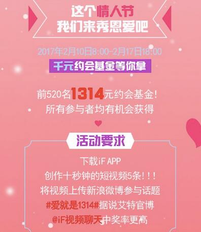 原来是@iF视频聊天搞的鬼,2月10日@iF视频聊天发起了#爱就是1314#的视频创作活动,以有趣的互动、千元奖金的“大招”改写了这个情人节的基调。