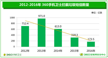 360手机卫士日前发布的《2016年中国手机安全状况报告》显示,去年360手机卫士共为全国用户拦截各类垃圾短信约173.5亿条,相较于2012年的700多亿,降幅高达75.6%,五年来整体呈现快速下降的趋势。