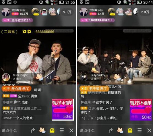 “好听”、“享受ING”、“一直喜欢他们的歌,从没有让人失望过”、“两个大男孩代表着民谣的未来”、“这声音,这台风,太有范了”、“必须购买新专辑”、“好妹妹乐队,我爱你”、“纯粹的音乐,纯粹的享受”……,网友们纷纷通过弹幕发表着自己的评论,并把火箭、游艇、跑车、金话筒、萌猫耳、巧克力等虚拟礼物送给了他们。