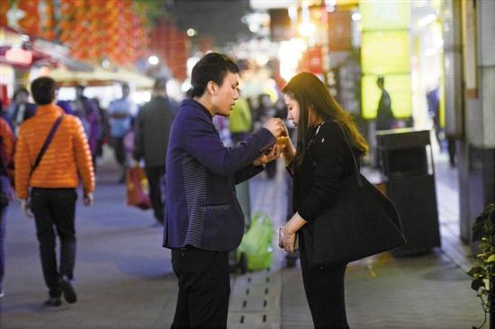 广州街头浪漫气氛渐浓,昨日一对情侣当街“秀恩爱” 羊城晚报记者 周巍 摄
