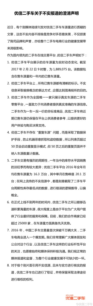 2月22日,优信二手车诉“互联网热点分析”及其运营主体张某某名誉权纠纷一案,北京市朝阳区法院已经于2017年2月22日正式受理,案号:(2017)京0105民初13441号。优信二手车在起诉书中要求包括被告立即删除账号相关侵权文章,停止对原告名誉权的侵害,并且支付赔偿金1000万人民币等。