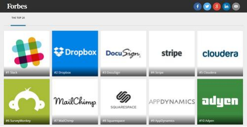 最近,福布斯发布了2016年最新非上市云服务公司TOP 100榜单, 从Top 10公司来看,Slack在100家云计算公司中遥遥领先,提供文件存储服务的Dropbox紧随其后,排名第二。第三名到第五名分别是电子签名公司DocuSign、支付公司Stripe,以及数据管理平台Cloudera。