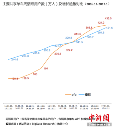 此次《报告》针对主要共享单车周活跃用户数据增长趋势进行分析,根据2017年1月最新数据显示,到2017年1月中旬,ofo的周活跃用户数达到436万。从增幅数据看,从2016年11月至2017年1月的3个月间,ofo周活跃用户数增幅达215%。