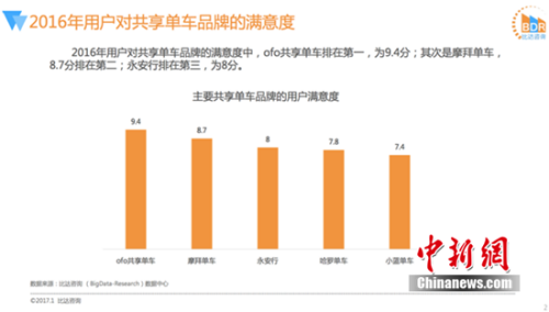 针对共享单车用户满意度调查方面,结果显示,ofo 用户满意度达到了9.4分,高出行业平均分达1.2分,位列共享单车品牌用户满意度第一。