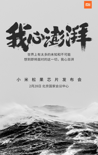 中新网2月20日电 小米公司今日对外发布邀请函。从邀请函来看,此次发布会主角是小米自家研发的处理器——松果芯片,发布会主题为“我心澎湃”。