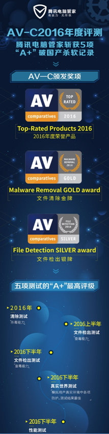 在AV-C2016年度的评测结果中,腾讯电脑管家(英文版)一共获得“2016年清除测试”“2016年下半年真实世界测试”“2016年下半年文件检出测试”“2016年下半年性能测试”“2016年上半年文件检出测试”五项测试的“A+”最高评级,这是国产杀软在AV-C评测史上获得的最高A+评级数量纪录之一。也因此获得了AV-C颁发的Top-Rated Products 2016、Malware RemovalGOLD award、File Detection SILVER award、Approved Security Product等奖项。这不仅是腾讯电脑管家参加AV-C年度评测以来获得的最好成绩,也是国内厂商在AV-C评测中取得的历史最好成绩。