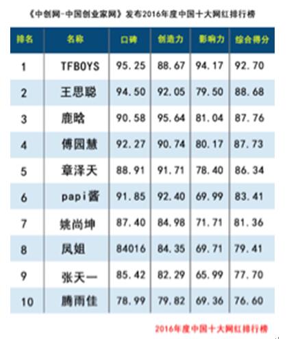 从这份“2016年中国网红排行榜”来看,TFBOYS组合在过去的一年里,口碑得分是95.25分,创作力得分88.67分,影响力94.17分,综合得分为92.70分,综合排名第一。而“国民老公”王思聪也仅位列第二。