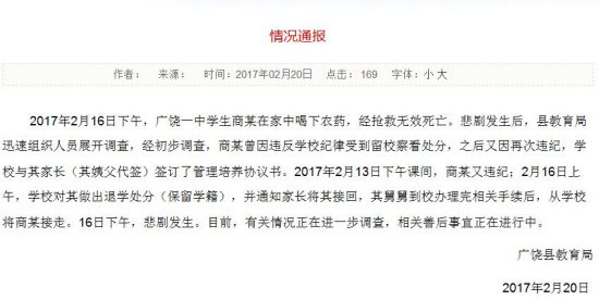 通报称,2017年2月16日下午,广饶一中学生商某在家中喝下农药,经抢救无效死亡。悲剧发生后,县教育局迅速组织人员展开调查,经初步调查,商某曾因违反学校纪律受到留校察看处分,之后又因再次违纪,学校与其家长(其姨父代签)签订了管理培养协议书。2017年2月13日下午课间,商某又违纪;2月16日上午,学校对其做出退学处分(保留学籍),并通知家长将其接回,其舅舅到校办理完相关手续后,从学校将商某接走。16日下午,悲剧发生。目前,有关情况正在进一步调查,相关善后事宜正在进行中。