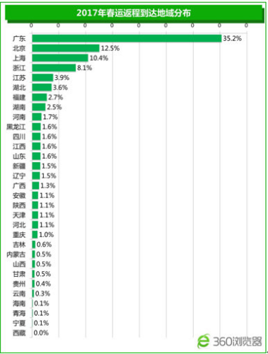 2月21日,360互联网安全中心和360浏览器联合发布的《2017年春运返程网络购票大数据报告》火热出炉,报告综合2017年1月1日-1月27日期间360浏览器的抢票数据为分析样本,选定2017年1月30日至2017年2月21日春节前出发的列车数据,分析内容包括:春运返程期间的用户购票时间、地域流动、热门线路、席别分析等,对2017春运返程形势进行了整体描述和分析。得出的结论对于研究国内劳动力流向、提升春运出行品质、指导民众合理安排行程方面具有重要参考价值。