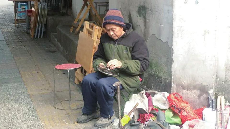 对现在的杨成华来说,补锅已不仅仅是糊口的工作,而成了一种习惯和爱好,“我也知道赚不了钱了,有时候一天下来都不开张的。不过不要紧,在这里跟街坊邻居聊聊天也蛮好的。在这儿这么多年,和很多老人都认识五六十年了,聊聊家常也开心,呆在家里闲着太恼火了,而且我出来补锅还能够锻炼身体。”老人乐呵呵地解释着,“再说一个月下来,总还有那么些生意的。”所以,尽管去年一年才补了5个铝锅,换了20多个锅把,杨成华还是每天准时到这儿来“上班”,而家住附近的女儿中午也会给他送饭来。
