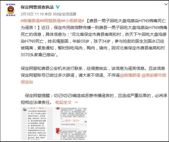 近日,一则传言在微信朋友圈中扩散开来,该传言称:“河北省保定市唐县南高和村,昨天下午因吃大盘鸡感染H7N9死亡,姓名绳某,年龄58岁,孩子34岁,参与抢救的医生刘国永已经被隔离,紧急通知,暂时别吃鸡肉,鸭肉,猪肉,因河北省保定市唐县南高和村5570头家禽已感染。”文末还强调:“收到马上发给你关心的人,预防永远胜过治疗。看到,群发扩散,此消息属实。”
