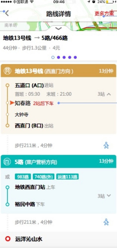 在“公交出行方案”的优化方面,搜狗地图优化了“偏好设置”和“换乘信息详情页面”,让公交查询功能体验妥妥提升。点击搜狗地图下方“路线”入口,进入后选择“公交”模式,其中“我的位置”已默认为当前所在地点,只需输入想去的目的地,多条路线就清晰显示出来。搜狗地图会提供“最快”、“少步行”、“直达”、“省钱”等多种出行方案供用户选择,并估算出大致所用时间、路线长度及对应票价,简直省心到不行!