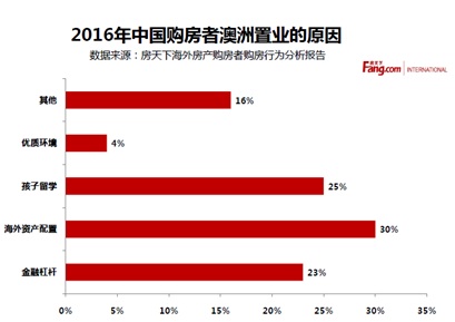 澳洲教育资源丰富、环境宜居,2016年澳洲小学生留学签证开放,加速中国人进行澳洲置业。调查显示,澳洲购房者大部分是30-40岁高净值人群,除了资产配置和金融杠杆等因素,23%购房是为孩子留学读书。