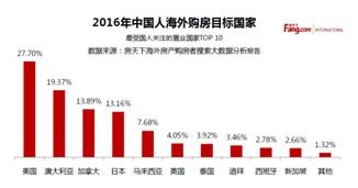 报告数据显示,2016年中国人海外购房目标国家中,美国仍是中国高净值人群海外置业最喜爱的国家,关注度高达27.7%。其他位列前四名的国家依次是澳大利亚(19.37%)、加拿大(13.89%)、和日本(13.16%)。