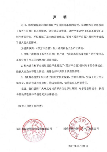 1.网络上流传的《孤芳不自赏》制片者“雇佣水军以及欠薪”的不实信息系部分别有用心的网络用户而已捏造。