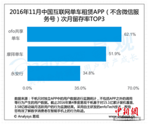 易观对15.1亿累计装机覆盖、3.58亿移动端月活跃用户行为进行监测,得到了数字消费者在智能手机上行为轨迹的综合结果。根据易观报告,ofo共享单车用户次月留存率达到62.1%,排名全国同类市场第一。而排名第二的摩拜单车,仅有51.9%的用户次月留存率,比ofo少了10.2个百分点,不到ofo用户次月留存率的85%。排名第三的永安行,用户月留存率34.8%,比ofo少了27.3个百分点,只有ofo用户次月留存率的56%。