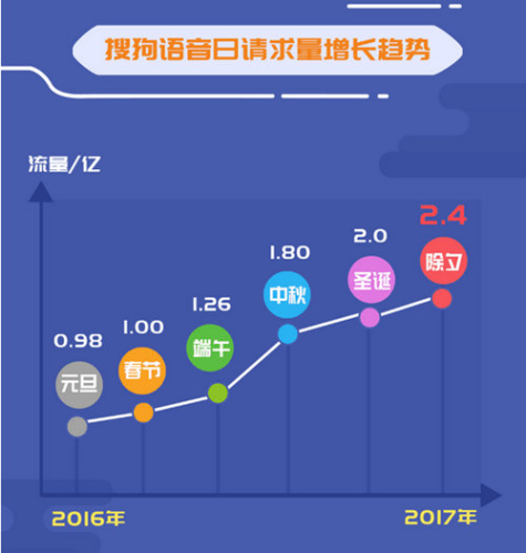 2016年,搜狗在人工智能引领下,实现了技术和内容的差异化,在技术方面与竞争对手拉开差距。目前,搜狗语音识别的速度现已达每分钟400字,语音识别准确率也已高于97%,极大提升用户输入体验。据搜狗语音大数据统计,每天有59%的用户会使用10-15次语音输入,搜狗输入法除夕当天日均语音请求更是高达2.4亿次,成为国内使用规模最大的语音输入请求应用。