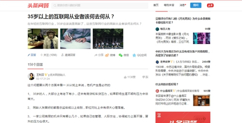而在今日头条的问答社区“头条问答”中,就提出了“35岁以上的互联网从业者该何去何从?”这个问题,同时吸引了不少业界人士的认真讨论。
