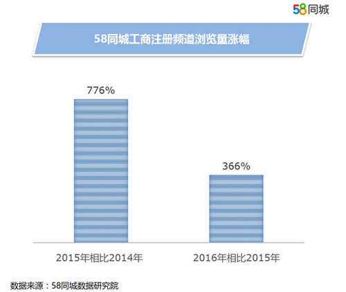 李克强总理最早在2014年就提出了“大众创新、万众创业”的号召,让创业风潮以无比迅猛的态势发展了起来。在58同城平台上,“自主创业”频道服务浏览量增幅惊人。“工商注册”类目的浏览量在2015年比2014年增长了776%,2016年又比2015年增长了366%。这一巨大涨幅充分说明了人们创业热情的高涨。