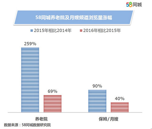 以58同城平台上养老院和月嫂频道的浏览量为例,2015年,“养老院”这一搜索关键词的浏览量和2014年相比,涨幅达到了259%,2016年再度实现涨幅69%;2015年,“保姆、月嫂”的浏览量比2014年增长了90%,2016年再度增长40%。这两组数据充分说明了人们对于育儿与养老的家政服务需求逐年攀升。“互联网+”通过精准的匹配过程,为婴幼儿提供了更优质的育儿资源,为老年人匹配了更有尊严的陪伴方式。