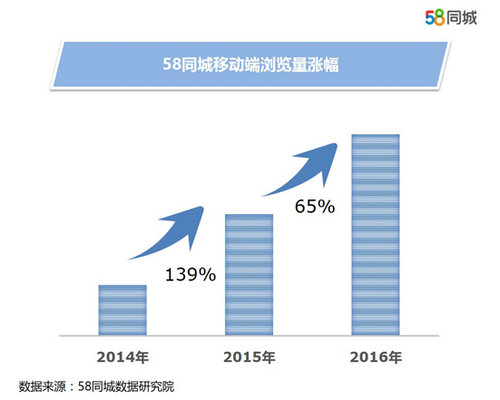 中新网3月10日电 日前,国内领先的生活服务平台——58同城通过一组数据,还原两年来“互联网+”为人们日常生活带来的巨大转变。据数据显示,2015年,58同城移动端浏览量比2014年增幅139%,2016年再度增幅65%。“互联网+”时代的到来,让生活、工作都变得更便利、更高效了。
