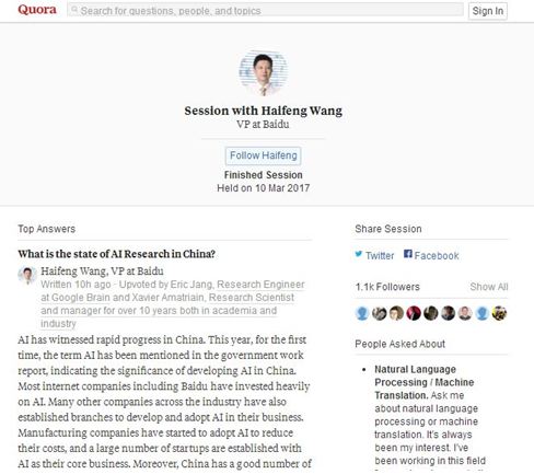 中新网3月10日电 近日,百度副总裁王海峰博士受美国问答网站Quora邀请回答网友提问,回答了颇具代表性的十个问题,覆盖从中国人工智能的发展阶段到百度工程师的日常工作状态,十问十答的形式,为美国网友打开了解百度,了解中国人工智能的一扇窗。