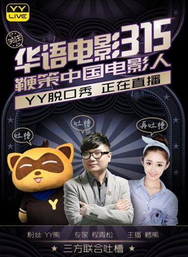 在3月10日-19日期间围绕“年度最令人失望电影”评选,在YY LIVE 59频道上线一组全新好玩的脱口秀系列节目。既有各大专业的高颜值主播陪你一起吐槽,更有中国资深影评人程青松与你鞭策中国电影人。